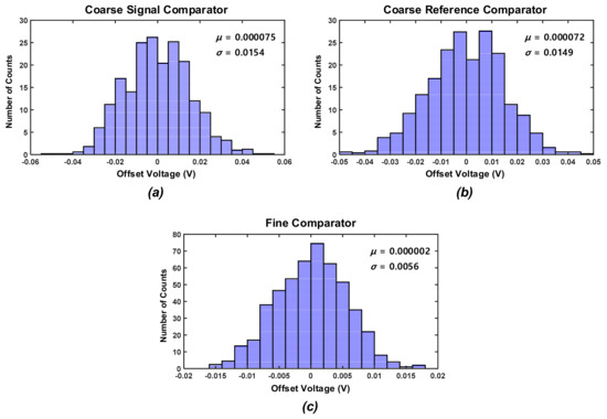 Histograms of the (a) coarse signal comparator, (b) coarse reference comparator, and (c) fine comparator offset voltage from Monte Carlo simulations with 1000 cases.