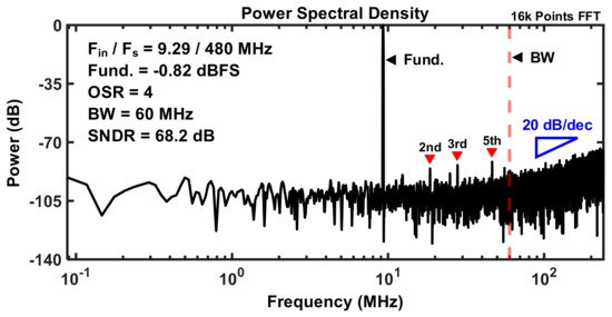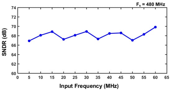 Figure 12 shows the output power spectral density of the proposed ADC with a sampling rate of 480 MS/s. An input signal at 9.29 MHz with a magnitude of −0.82 dBFS was used. The result shows an SNDR of 68.2 dB for a 60 MHz bandwidth (OSR = 4). The total power consumption of the proposed ADC was 2.13 mW under a 1.1 V supply voltage. Figure 13 shows the simulated SNDR versus the input frequency at 480 MS/s. A flat result was obtained from 5 MHz to 60 MHz. Figure 14 shows the SNDR variation according to the temperature from −40 °C to 140 °C under different process corners. Simulations for each corner were performed at sampling rates of SS: 430 MHz, TT: 480 MHz, and FF: 540 MHz, respectively, and it can be seen that almost the same SNDR was obtained at all temperatures.
