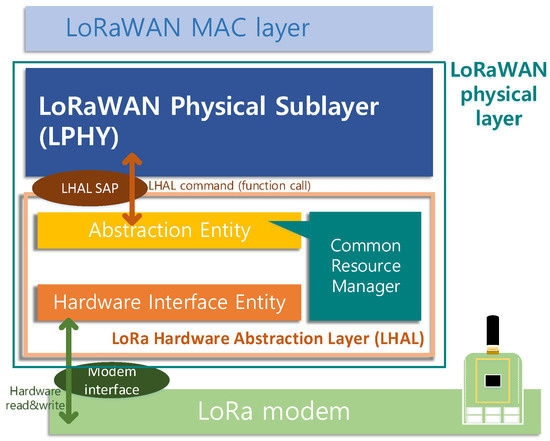 As illustrated in Figure 2, the overall LHAL is vertically divided into abstraction and hardware-interface entities. The abstraction entity manages the abstracted factors of the LoRa modem, such as status and configuration parameters, and directly handles LHAL commands from the upper sub-layer. It commonly checks the validity of incoming LHAL commands based on the current status of the LoRa modem for keeping the LoRa modem away from erroneous operations due to invalid control. On the other hand, the hardware-interface entity is responsible for direct control of the LoRa modem hardware. It provides hardware-specific functions of configuring and operating the LoRa modem hardware to the abstraction entity. Once the LHAL receives an LHAL command from the upper sub-layer, the abstraction entity first analyzes the LHAL command in the hardware-independent aspect. Then, the abstraction entity calls proper hardware-specific functions provided by the hardware-interface entity for triggering proper operation of the LoRa modem hardware.