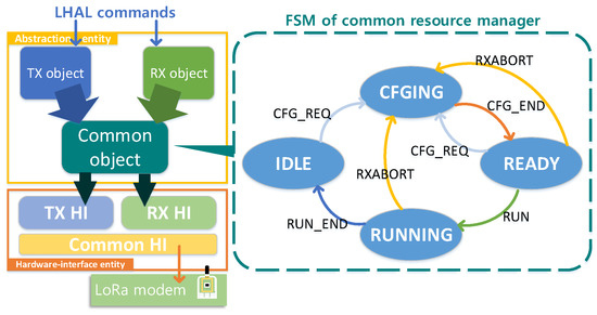 Figure 3 illustrates the detailed mechanism of the LHAL and interaction between the LHAL entities. The abstraction entity operates based on the interactions among the TX, RX and common objects. Incoming LHAL commands let the TX and RX objects to configure TX and RX parameters, respectively, or to make the LoRa modem start its operations. Since the LoRa modem can only do TX or RX at a moment, each LoRa modem hardware has a common register set for the RF signal processing and this register set is configured in both TX and RX cases. So the TX and RX objects access to the common register set, and the common object arbitrates in using the common register set between the TX and RX objects. The common object can only access to the functions of the hardware-interface entity in the abstraction entity, and the TX and RX objects access to the hardware resource through the common object.