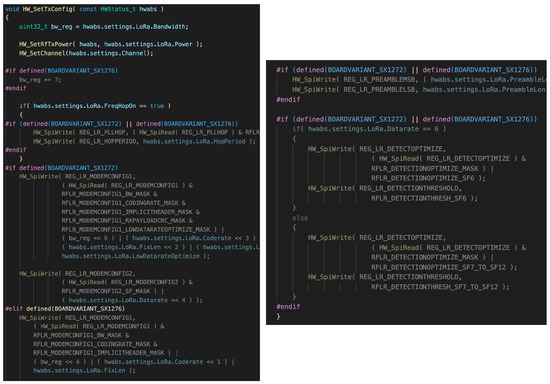 For efficient code implementation for the hardware-dependent parts, we utilized a macro as a build option for each hardware model. The build option enables us to select a suitable hardware-dependent code at build time and to obtain a compatible binary to the target hardware model. Figure 4 shows the example of the hardware-dependent code in the HW_setTxConfig function. The code for handling the registers common to both SX1272 and SX1276 is enclosed with BVARIANT_SX1272 and BVARIANT_SX1276 macros. Some parts of the code dealing encParms and freqParms registers need to be hardware-dependent and are separately implemented according to target hardware models. In the case of supporting a new hardware model, we can define a new macro as the build option of the new hardware model and simply add the additional handler code dedicated to the new hardware model.