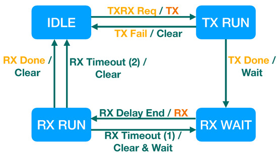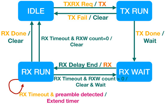 Based on the states and events, the FSM design can be finished up by defining transitions for every state and event occurrence. The LPHY begins from the IDLE state and transits to the other state when the TXRX Req event happens. The service primitive makes the LPHY initiate TX and opens two consequent RXWs after the TX Done event, so this event triggers a transition from the IDLE state to the TX RUN state. When the TX Done event happens in the TX RUN state, the state is changed to the RX WAIT state for waiting until an RXW opens. Unlike in the IDLE state, the LPHY in the RX WAIT state ignores the pending TX operation for receiving the upcoming downlink packet. When a timer expires and the RX Delay End event happens, the state is changed to the RX RUN with starting RX. If a downlink packet is received, then the state returns to the IDLE for not opening the second RXW. If no packet is received in the first RXW, the LPHY needs to look for the second RXW and the state is changed to the RX WAIT and return to the RX RUN for opening the second RXW. The second RX timeout event lets the state change back to the IDLE.