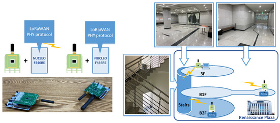 Whereas the proposed protocol has advantageous architecture in a flexible and unified form, it is needed to verify how the proposed protocol performs in practice. The performance of the proposed protocol is measured through test experiments with real-time embedded systems and compared with the conventional software provided by Semtech. Figure 8 shows the overall environment of the test experiments. We used two real-time embedded systems that play roles of a gateway and an end-node, and the LoRaWAN PHY protocol is implemented and runs on the end-node side system. (The source code implemented for the proposed LoRaWAN PHY layer can be accessed in the open source platform [58].) Each embedded system is composed of NUCLEO F446RE as the hardware platform of the PHY protocol software and SX1272 as the LoRa modem. We conduct tests in indoor environments where IoT devices are generally placed.