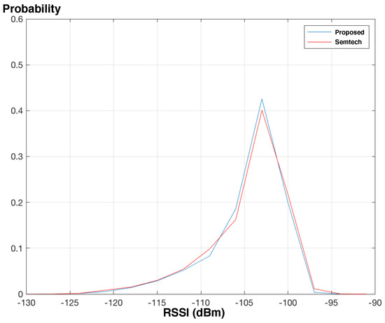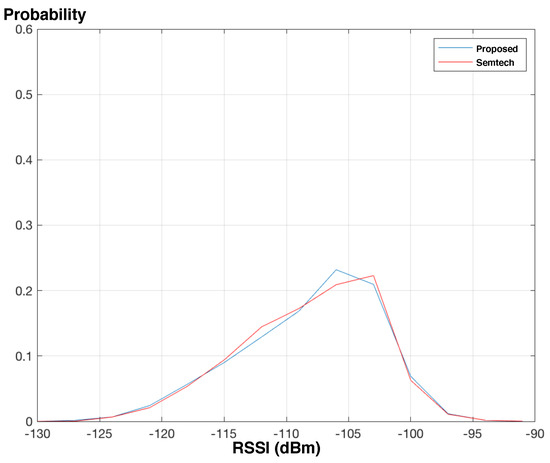 We first conducted a regression test for verifying whether the proposed protocol software in the restructured architecture performs in the same level as the conventional protocol software provided by SemTech. Figure 9 and Figure 10 show how the end node receives signal and downlink packets are received with respect to the signal environment. The results reveal that the end-nodes with the conventional and proposed protocols experience the RSSI of similar distributions if the end-nodes are identically located. The results also reveal that the end-node with the proposed protocol successfully receives packets similarly with the conventional protocol.
