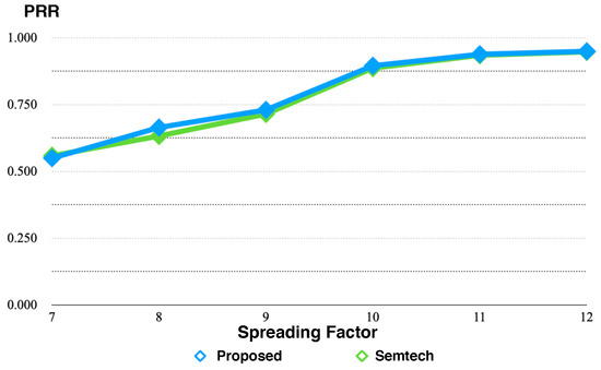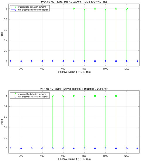Figure 14 shows the PRR when the end-node configures RD1 as 100–1300 ms. In the case of DR0, the end-node without the RXW prolonging scheme always fails to receive downlink packets in the RXW1 regardless of RD1 value, since the LPHY aborts the RX operation of the LoRa modem at the end of the RXW1. On the other hands, the end-node with the RXW prolonging scheme successfully receives downlink packets in the RXW1 when the RD1 is from 700 to 1200, since the LPHY recognizes that preamble is detected at the end of the RXW1 and keeps the RX operation. In this case, the end-node fails to receive downlink packets when the RD1 is less or equal to 600 ms because RXW1 ends before the LoRa modem completely detects preamble, and also is larger than 1300 ms because the RXW1 starts after the the gateway begins to transmit the preamble. Similar trend can be observed in case of DR1 and the end-node with the RXW prolonging scheme successfully receives packet in RXW1 when the RD1 is between 400 ms and 1200 ms. The range of the RD1 that the end-node successfully receives varies since the time duration and interval of the preamble transmission get changed.