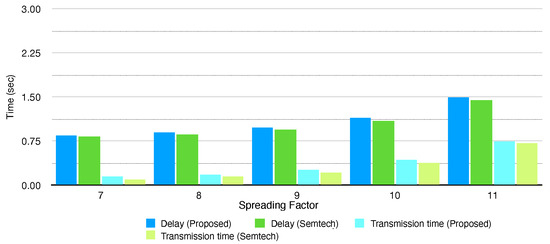 Table 7 shows the parameters of the LoRa modulation, which are based on the regional regulation of the LoRaWAN specification in South Korea. The spreading factor is from 7 to 12, which are denoted by DR5-DR0, and the bandwidth and code rate are commonly configured as 125 kHz and , respectively. The first and second RDs are 1 and 2 s, respectively, and the RXW size is 1 s. To ensure successful acknowledgements at the end-node, the gateway sends a downlink packet 0.1 s after each RXW opens. Table 7 also shows which RXW is used according to the data rate and packet size. RXW1 is mostly used, and RXW2 is used in the case that the transmission time is longer than the RXW1 size.
