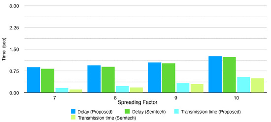 As the end-node experiences are enhanced PRR in the RXW1, we can see that the delay times of the downlink packets are shortened in case of the RXW prolonging scheme. The end-node whose PRR is low in the RXW1 will result in frequent reception of the downlink packet in RXW2, and this causes additional delay time of . As shown in Table 9, the RXW prolonging scheme makes the delay time to be reduced by 19.7–23%. Accordingly, the experiment results validate that the RXW prolonging scheme, which requires simple modification of our protocol, effectively advances PRR in RXW1 and eventually improves the overall delay time of the downlink packets.