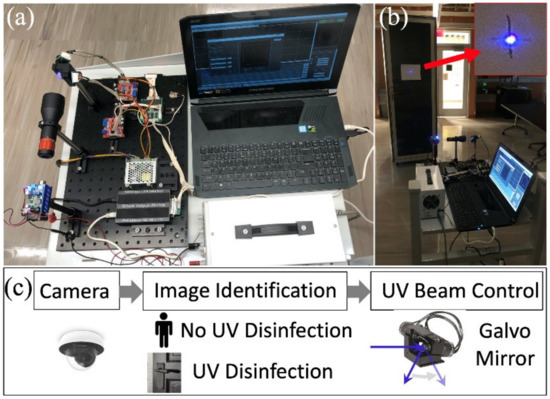 Artificial intelligence (AI) is used to analyze the image from a camera sensor, identify the surface that requires disinfection, and avoid human exposure to UV irradiation. A selective disinfection and sterilization system increases the efficiency of disinfecting a given area and, with proper measures, also increases the overall safety [12,13]. This in turn enables the system to be “smart”, where it can function autonomously and perform disinfection to the contaminated surfaces while avoiding exposure to humans. An autonomous system capable of discerning whether an object needs to be disinfected, or prevented from being exposed to a laser, allows the system to be used at any time of day and in more scenarios compared to the UV LED application mentioned above.