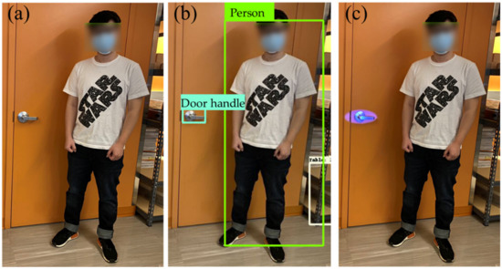 (a) Original image of a person standing in front of a door; (b) image recognition result with Deep Learning; (c) the area that needs to be disinfected is illuminated.