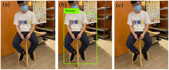(a) Original image of a person sitting on a chair; (b) image recognition result with Deep Learning; (c) UV disinfection is turned off because a person has been detected.