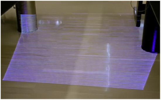 Through the rapid vibrating mirror, the laser can scan a designated area to achieve the desired disinfection. The galvo system has a vibration frequency of up to 60 Hz. Because the scanning method quickly moves the focus, the intensity of the laser in a short period is high enough for thorough disinfection. Figure 5 was created by overlaying the video frames of the system simulating disinfecting a section of the floor. Note: The gaps seen between the laser passes are due to the frame rate of the video; however, the laser beam did hit every point in the given area.