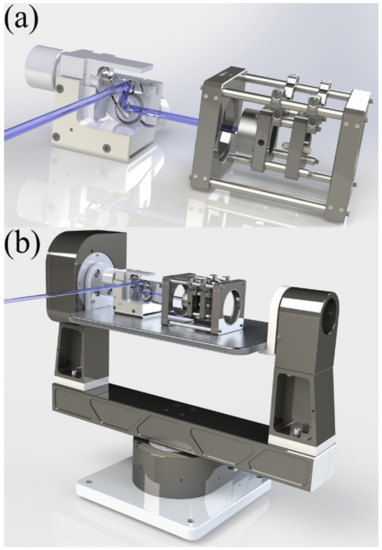 Figure 6a shows a render of the device in its simplest form. It includes the laser, in addition to the focus and the enclosure for both devices. It also shows the galvanometer and a demonstration of how the laser can be angled. These components were commercially available [22] and configured to work with our design. Figure 6b shows the device in Figure 6a, combined with a two-axis gimbal [23], to provide the widest possible range of motion. This model was made to show the capability of the system, even in a stationary location.