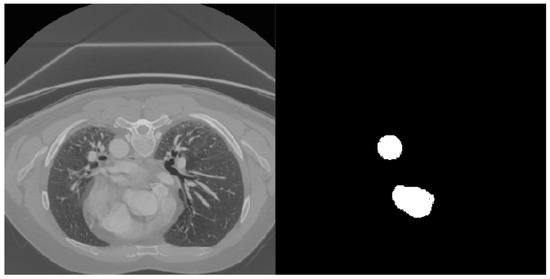 After pre-processing, CT scans were cropped to reduce their size. This also allowed one to remove parts of the scan where the aorta was not present (normally, the entire scan goes from the pelvis to the head). The dimensions of the 3D bounding box were multiples of 32 (to have a final image size that fit the input of the chosen segmentation network without using padding). Finally, the slices for each view (coronal, sagittal and axial) were extracted and used for network training. An example of an axial slice together with its label is given in Figure 3.