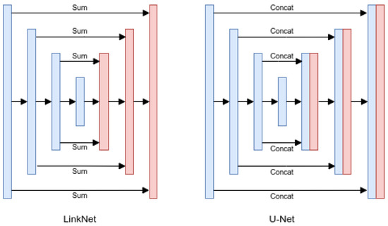 A simplified schematic of the two networks employed in this work, U-Net (on the right) and LinkNet (on the left).