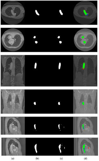 Some erroneous segmentation results. In (d), green represents correctly predicted pixels, blue pixels are present in the label but not predicted as aorta from the network, and red pixels are incorrectly predicted as aorta. (a) Original images; (b) Ground truths; (c) Network predictions; (d) Predictions overlapped with labels and pre-processed original images.