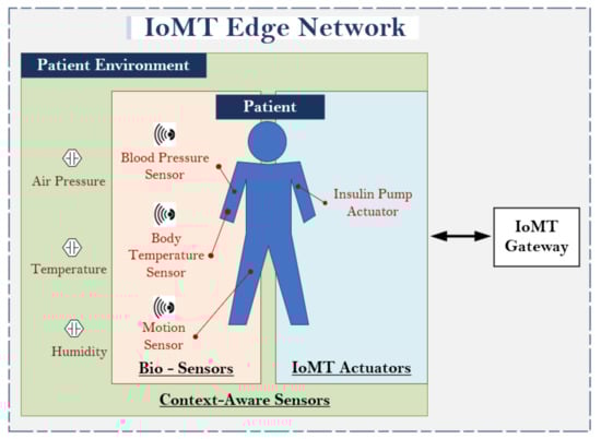 - “context-aware sensors”, another type of IoMT sensor, for gathering context information (e.g., air pressure, humidity, or room temperature) from the patient environment;
