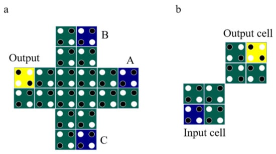 A square cell with two electrons in four spots is the basic component of QCA technology. These electrons can freely tunnel between the dots, but not out of the cell. P = 1 and P = +1 are two stable states that produce two polarizations. The digital numbers “0” and “1” correspond to these two polarizations [,]. Figure 1a shows the polarization of the QCA cells.