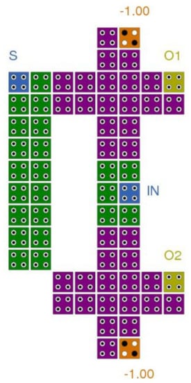 The demultiplexer converts input serial data into several output parallel lines. The block diagram of the proposed demultiplexer is demonstrated in Figure 4a. Therefore, in designing a QCA-based fault-tolerant 1:2 demultiplexer, two clock phases are necessary for producing a stable output, as illustrated in Figure 4b. The proposed demultiplexer has output lines (O1, O2), a select line (S), and an input line (IN). Generally, it transfers the inputs to one of the outputs depending on the select (S) line value. The suggested circuit was schematized using one fault-tolerant inverter and two fault-tolerant majority gates. The demultiplexer’s single input (IN) is directly linked to an input line of the majority gates. The first inputs in majority gates are S, 0, and IN, and the second majority gate inputs are S, 0, and reverse of IN. If the select line value is ‘0′ (S = 0), the IN signal is transferred to the output O2, whereas if the value of the select line is ‘0′ (S = 1), the IN signal is transmitted to the output O1. The truth table of the digital demultiplexer is demonstrated in Table 1. Our suggested design for a fault-tolerant 1:2 demultiplexer is shown in Figure 5. The inputs were inserted from one side of the scheme and the outputs were inserted from the other. The efficiency of the fault-tolerant demultiplexer was attained through inverter gates, wire, and fault-tolerant majority. We used wire redundancy to realize the fault-tolerance ability in the suggested demultiplexer. Here, the input cells fixed the polarization. Moreover, the output and middle cells were variable, and this design is provided in one layer.