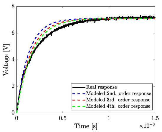 The controller behaves as shown in Figure 10. In this case, the voltage becomes adjusted with a lower error range, and the theoretical response becomes quite close to the real one. Although the response of the controller is slower, it does not affect the application in question since the battery voltage also changes slowly.