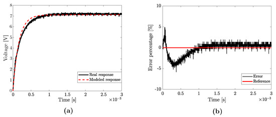 Plant response to step input. (a) Comparison between real and modeled response. (b) Error obtained by comparing the real response and the modeled response.