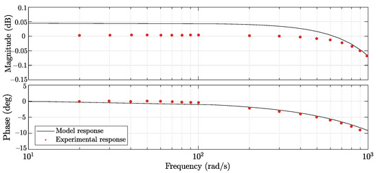 The model is now compared to the prototype to verify that both behave in the same way in terms of the frequency response. In this case, a bode diagram of the modeled system is compared with the prototype response. The prototype is tested up to 10 rad/s, this is because the frequency in which the battery will be charged will not exceed this parameter. The bode diagram can be seen in Figure 6.