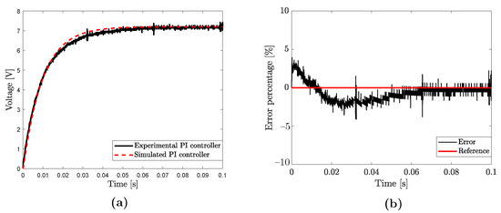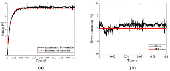 Case 1 with . (a) Controller response. (b) Error obtained by comparing the simulated controller and the experimental controller.