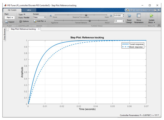The response of the system is determined by the values that are assigned to and . Two possible control approaches are considered. The first test is carried out considering a rise time of 20 ms, which is shown in Figure 8. MATLAB’s PID Tuner was used to determine the values for and . The tuner is shown in Figure 9. The obtained values are: