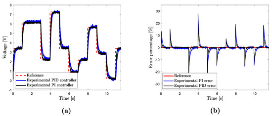 Response to random step signal. (a) Controller response, PI and PID case. (b) Error obtained by comparing the simulated controllers and the experimental controllers.