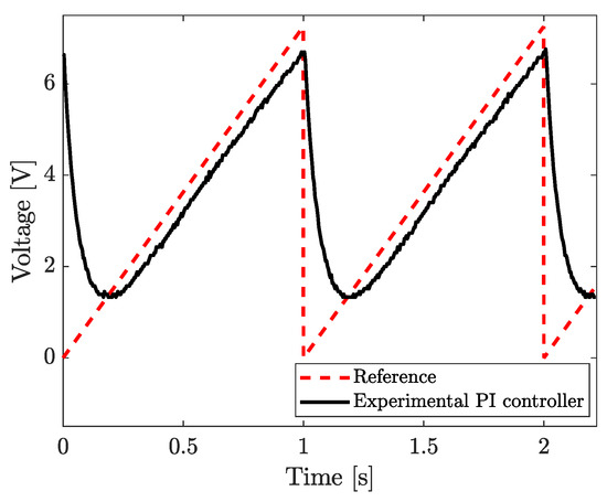Now, the setpoint is changed to a sawtooth signal as shown in Figure 12. In this particular case, it is more difficult for the PI controller to adjust to the reference when it changes drastically. A different tuning or a more complex controller might be needed to be able to adjust to these abrupt changes.