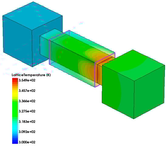 In this study, we used the TCAD Sentaurus Device (SDevice) to simulate the electrical and thermal characteristics of GAAFETs [7]. The device parameters of the GAAFET are summarized in Table 1 [8], and the electrical characteristics of the GAAFET in the simulation environment are listed in Table 2 [9,10,11]. In Refs. [9,10,11], the authors set the target specifications for the electrical characteristics that the GAAFETs are required to satisfy in the 5 nm technology node. The results of our simulations are also presented in Table 2. To satisfy the target electrical characteristics of the GAAFETs, various physics-related models and parameters were calibrated. The calibrated saturation velocity and the exponent in the high field saturation electron mobility model are used for the quasi-ballistic transport inside the very short channel structure [12]. In addition, the Lombardi mobility model for the consideration of Si/SiO2 interface, the lattice temperature-dependent mobility degradation model for the consideration of the SHE [13], the inversion/accumulation layer mobility model, and the thin-layer mobility model for the scaled channel [14] are used to calibrate the electrical characteristics, as has been documented in our previous work [2]. With these models, the thermodynamic transport model is applied simultaneously to consider the SHE conditions. With the thermodynamic transport model, the lattice temperature equation is simultaneously considered while solving the Poisson coupled drift–diffusion (DD) equation. Thus, the driving current is estimated by both the DD and lattice temperature equations, which corresponds to the current at the self-heating condition. For precise simulation of the SHE, various thermal-related parameters are defined in our simulation, based on the specifications in [15]. For the consideration of defining the thermodes of the device, proper thermal boundaries, including the thermal contact area and the thermal resistance at thermal contact, have to be considered. For the definition of thermal contacts, a temperature of 300 K is initially applied to the thermode contact. Thermodes in our simulated device are defined as the same region of electrical contact region, i.e., source, drain, and gate electrodes. Thus, the thermal effects by the input power have been evaluated under the same dimension as the contact area. Then, the thermal contact resistance of the thermode contact has been taken by referring to [16,17]. When compared with thermal contact resistance of [10], our estimated thermal contact resistance is 3.33 × 106 K/W. By applying the thermal contact resistance with 3.33 × 106, the simulated GAAFET is heated up to about 360 K at maximum, which is consistent with the result in [17]. The simulated structure of GAAFET, containing the lattice temperature distribution, is depicted in Figure 2. By referring to papers [16,17], the simulation for the consideration of proper thermal boundaries has been implemented. After simulation of the SHE, we extracted the thermal characteristics of the GAAFET from the TCAD results. From the DC simulation results, the RTH value was obtained using Equation (3). The CTH and τTH values were extracted using different rise time simulations after the AC transient simulation, which was previously introduced in [16] and also used in our previous work [8].