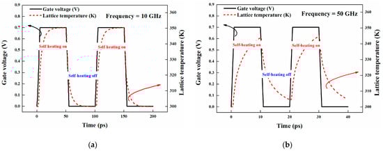 Lattice temperature response to the gate voltage of (a) 10 GHz and (b) 50 GHz.