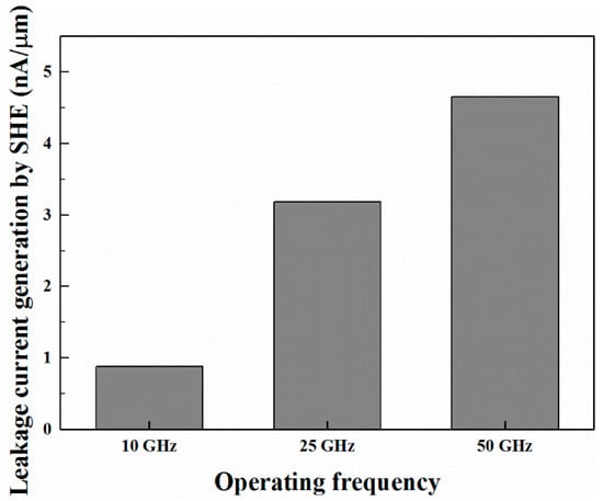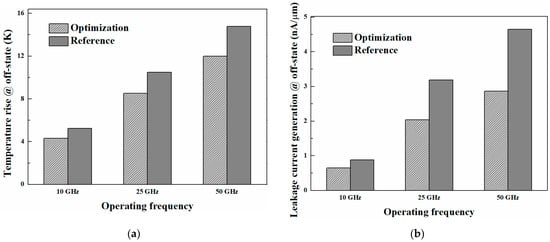 Figure 15 presents comparisons between the SHEs for both the optimized structure and the reference structure, in terms of lattice temperature increase and leakage current generation. Figure 15a shows comparisons between the temperature increases at the off-phase of the pulse, before and after optimization; here, less increase in the lattice temperature is observed at the optimized structure for each operating frequency. As the operating frequency increases, there is a corresponding increment in lattice temperature; however, the decreases in the rates of temperature rise after optimization are similar (about 20%) for each of the operating frequencies, i.e., 10, 25, and 50 GHz. Thus, we could suppress the increase in lattice temperature by about 20% when the optimized device was biased with an AC pulsed signal. Figure 15b shows the optimization results for the leakage current generation at the off-phase of the pulse by the SHE. It can be seen that the leakage current generation is also suppressed according to the suppression in temerpature rise, similar to that in Figure 15a. It is worth noting here that the leakage current generation is suppressed by about 40% at the opreating frequency of 50 GHz after optimization. Thus, we could improve the thermal generation and leakage current properties induced by the SHE of the GAAFET by modeling and optimizing the thermal time constant τTH.