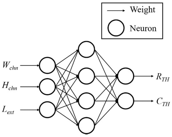The neural network modeling of the thermal characteristics, RTH and CTH, was achieved using MATLAB from MathWorks. Figure 5 illustrates the schematic of the neural network model for prediction of the thermal characteristics. As shown in Figure 5, we set the device parameters as the input set of the model and the thermal characteristics as the output set. Since τTH is the product of RTH and CTH, we set the outputs of the model as RTH and CTH [8]. Thus, we simulated the means by which RTH and CTH could be influenced by varying the device parameters. The device parameters were varied in the range of 3–7 nm for both Wchn and Hchn, and in the range of 4–16 nm for Lext. From the TCAD simulations, the thermal characteristics (i.e., RTH, CTH, and τTH) were extracted. Using these extracted thermal parameters, the shallow neural network was trained to predict the thermal characteristics in accordance with structural variations. These three parameters were simulated with five divided points within the variation range, so that the training and testing of the network were implemented using a total of 125 (53) cases of non-replicated combinations of the input and output sets. We built the shallow neural network model using a single hidden layer with four hidden neurons, as shown in Figure 5. In our model, we used the tangent hyperbolic function shown in Equation (1) as the activation function [19].