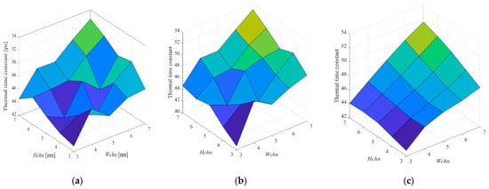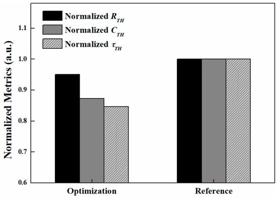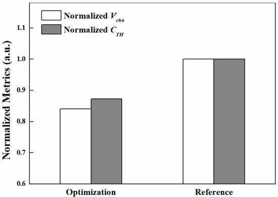 Figure 11 shows that the optimized structure has a smaller τTH than the reference structure. The reference structure in the figure also indicates the structure before the optimization, which is also depicted in Figure 1. As seen in the figure, the RTH value remains almost unchanged (~5%) but perhaps slightly decreased, which is the result of the constrained condition of the algorithm. Unlike the trend of the RTH, the optimized structure has a relatively decreased CTH value, which contributes to the reduction of τTH. Since the heat generated by the SHE is confined and transported within the volume of the channel (Vchn), the heat capacity is proportional to the Vchn. As shown in Figure 12, the optimized structure has a smaller channel volume than the reference structure of the GAAFET. Furthermore, it can be seen from Figure 12 that the decrease in CTH is similar to the decrease in Vchn. Thus, the decrease in the channel volume after optimization is the main contributor to the smaller CTH value, which results in the decrease in τTH properties. The thermal characteristics before and after optimization are compared in Figure 13 and Figure 14.
