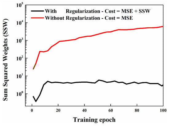 From Equation (2), it is seen that the equation is a sum of two different quantities. The first is the sum of squared errors (SSE) and the other is the sum of squared weights (SSW). The SSE and SSW are expressed as ED and EW, with coefficients β and α (β + α = 1), respectively. If β is closer to 1, the network is trained to focus on smaller errors; however, if β < α, then the training process considers reducing the weight values rather than the errors. Thus, appropriate selection of β and α values is important when training the model. In this study, the method for estimation and calculation of β and α is derived from Refs. [20,21]. In accordance with Equation (2), the cost function has a penalty that is proportional to the SSW. Since the weight and bias values in the network are determined when the cost function is minimized by the backpropagation method [22], larger values of the weight parameters are rarely accepted, owing to the increased penalty in the cost function for larger weights. Using the restrictions where the weight values are distributed in a narrow range near 0 and the penalty in the cost function is as suggested in Equation (2), we build a generalized model with mechanisms for the prevention of over-fitting problems.
