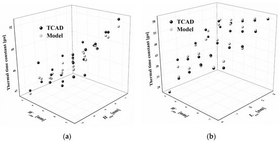 Scatter plot of thermal time constant, along with variation of (a) Wchn and Hchn, (b) Wchn and Lext.