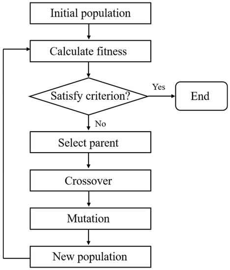 Figure 9 describes the optimization scheme of the genetic algorithm in our manuscript. For optimization by the genetic algorithm, various parameters related with optimization process were used. For the selection, the tournament selection function was used and the selection parameter—the selection tournament size—was 2. A crossover fraction of 0.8 was used for crossover. At last, the mutation parameter (the mutation rate) was set to be 0.01 (1%).