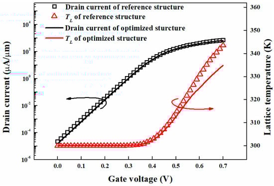 In Figure 13, the DC characteristics of the SHE are examined by sweeping the DC voltage at the gate electrode from 0 to VDD (0.7 V); further, the drain current to gate voltage (I–V) transfer characteristics are illustrated with lattice temperature information. It is observed that the drain current properties before and after optimization are only slightly changed. In terms of the lattice temperature, the optimized sturcture shows improved characteristics for thermal generation. As seen in Figure 13, the temperature rise inside the device is suppressed while maintaining the operating current, which is directly related to the DC power. This means that the opimized device generates less heat than the reference structure for similar levels of DC power consumption [24]. From Equation (3):