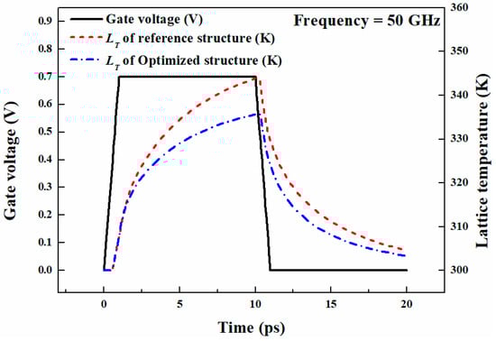 The lattice temperature properties with propagation of the AC pulse as gate bias, after the optimzation process, are presented in Figure 14 for both the optimized and the reference structures. In Figure 14, the rise in the maximum lattice temperature by the SHE is suppressed after optimization, and a smaller temperature rise at the off-phase of the pulse is observed. Less temperature increase in the off-phase of the pulse indicates that the thermally generated leakage current can be successfully suppressed after optimization.