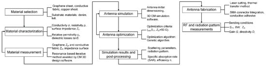 Fabrication procedure of (a) graphene sheet and (b) conductive fabric patch antennas on several substrate textiles.