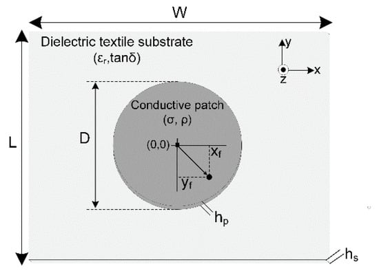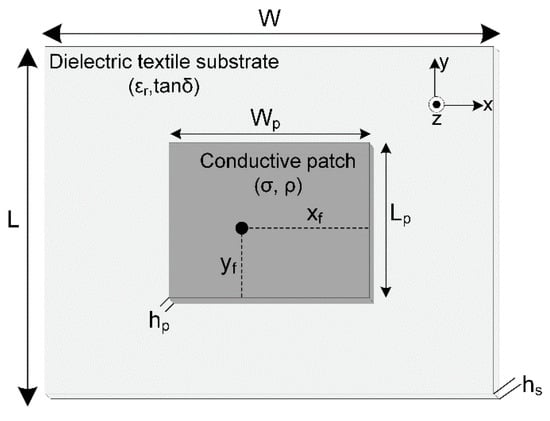The geometry of the wearable, rectangular, under-study antenna is shown in Figure 2, where a probe-fed, rectangular microstrip patch is illustrated as a structure consisting of 5 layers: (1) the upper-layer radiator, which is a conductive rectangular patch (made of graphene sheet, conductive fabric, or copper sheet), with length Lp, width Wp, and thickness hp; (2) the ultra-thin bonding-layer (double sided thermoplastic adhesive), attaching the patch and the substrate fabrics, with length Lp, width Wp, and thickness ~10 μm; (3) the middle-layer dielectric substrate (made of denim D1, denim D2, felt F1, or felt F2 textile), with length L, width W, and thickness hs; (4) the same as before, an ultra-thin bonding-layer, now attaching the substrate and the ground-plane fabrics, with length L, width W, and thickness ~10 μm; and (5) the bottom-layer ground plane (made of the same conductive material as the upper-layer), with length L, width W, and thickness hp.