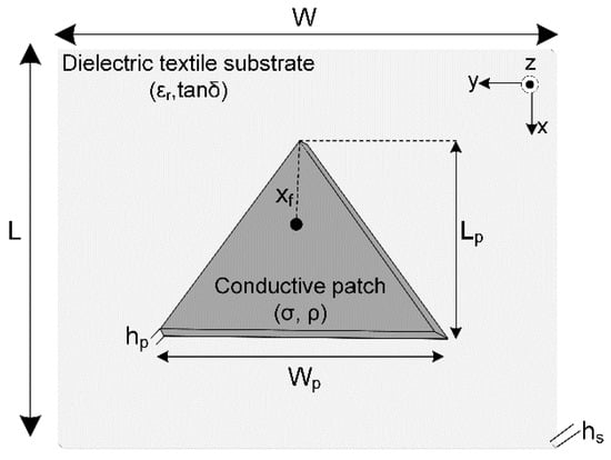 The geometry of the wearable, triangular, under-study antenna is shown in Figure 3, where a probe-fed, triangular microstrip patch is illustrated as a structure consisting of the same five layers described in the previous section. Here, the rectangular, upper-layer patch and the rectangular, bonding-layer adhesive of Figure 2 were replaced by an isosceles triangular conductive patch, with height Lp and base length Wp, and an equal triangular bonding-layer adhesive, respectively.