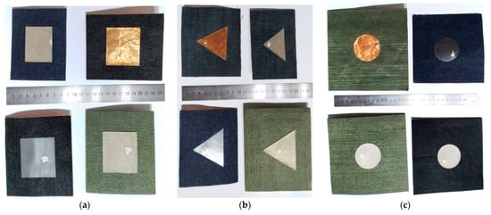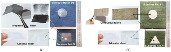 All antenna prototypes have been fabricated by using a double-sided thermoplastic adhesive to bond each conductive patch with the corresponding dielectric substrate. The fabrication procedure is graphically presented in Figure 5. The graphene sheet of Figure 5a, the conductive fabric of Figure 5b, and the adhesive-sheet are cut precisely to the optimized dimensions of a rectangular, triangular, or circular patch using a CO2 BRM laser (150-Watt) and permanently attached using thermal transfer method (due to the ultra-thin bonding-layer adhesive) upon the corresponding textile substrate, previously cut to the appropriate size.
