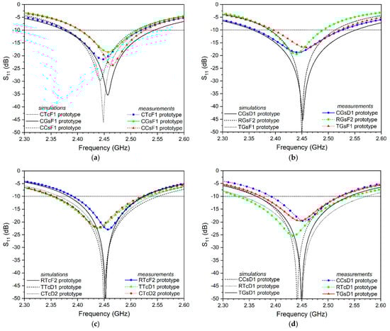 The measured and simulated reflection coefficient (S11 magnitude) is plotted in Figure 7 for: (a) the three circular CTcF1, CGsF1, and CCsF1 prototypes with the same felt F1 substrate but different patch materials; (b) the three graphene patch CGsD1, RGsF2, and TGsF1 prototypes with different substrate materials and patch shapes; (c) the three fabric-patch RTcF2, TTcD1, and CTcD2 prototypes with different substrate materials and patch shapes; and (d) the three denim D1 substrate CCsD1, RTcD1, and TGsD1 prototypes with different patch materials and patch shapes.