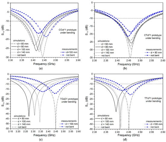 According to Figure 9, the resonant frequency (fc) of the bent antenna decreases almost monotonically as the tube diameter also decreases. This characteristic behavior is more obvious for the graphene sheet patch antennas, in comparison to the conductive fabric patch ones, as well as for the triangular patch antennas, in comparison to the circular patch ones. For example, the simulated fc of the TGsD1 (TTcF1) prototype in Figure 9c,d was 2.45 (2.45) GHz for the not-bent case, and 2.345, 2.309, and 2.272 (2.416, 2.412, and 2.395) GHz for bending over a tube with diameters of 140, 100, and 80 mm, respectively, while the simulated fc of the CGsF1 (CTcF1) prototype in Figure 9a,b was 2.443 (2.457) GHz for the not-bent case, and 2.428, 2.425, 2.415, and 2.407 (2.461, 2.459, 2.460, and 2.458) GHz for bending over a tube with diameters of 140, 100, 80, and 60 mm, respectively. The same behavior also holds true for the measured resonant frequency, as the measured fc of the TGsD1 (TTcF1) prototype in Figure 9c,d was 2.446 (2.461) GHz for the not-bent case and 2.365 (2.423) GHz for bending over a tube with a diameter of 100 (100) mm; while the measured fc of the CGsF1 (CTcF1) prototype in Figure 9a,b was 2.457 (2.460) GHz for the not-bent case and 2.424 (2.447) GHz for bending over a tube with a diameter of 100 (80) mm.