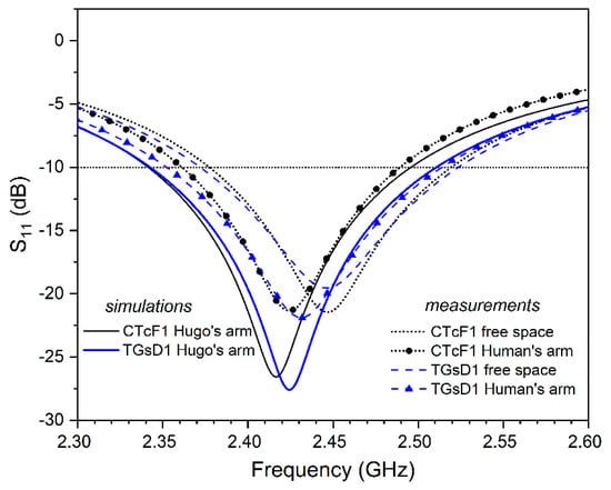 Measured and simulated magnitude of S11 versus frequency for the CTcF1 and TGsD1 antenna prototypes, when the antennas are in free space (measurements), body-mounted on CST-Hugo’s arm (simulations), or body-mounted on real human’s arm (measurements).