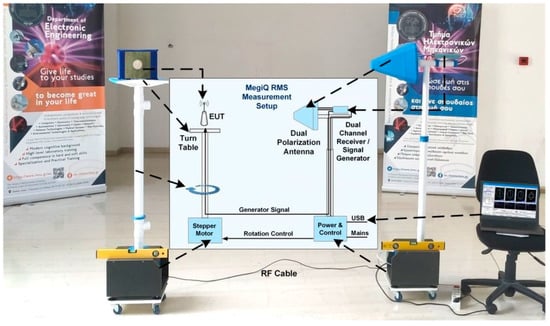 The radiation patterns and characteristics of all prototypes were simulated with the CST Studio Suite 2021 software and measured with the MegiQ RMS-0660 radiation measurement system. The measurements took place using the direct method, having an ±1 dB uncertainty, according to the manufacturer. Figure 11 presents a picture of the measurement setup at work.