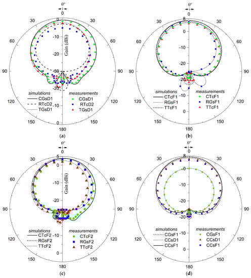 Figure 12 shows representative results for the θ-plane (elevation plane or E-plane) radiation patterns of 12 different prototypes. The dotted, dashed, and solid curves illustrate the simulated results, whereas the circles, squares, and triangles present the corresponding measured E-plane radiation patterns of the patch antennas, mentioned for each inset. At the same time, Figure 13 presents the 3D radiation patterns of six different prototypes with the same F1 substrate. All patterns of Figure 12 and Figure 13 are plotted for the corresponding prototypes’ resonant frequencies, which are shown at the first two rows of Table 2, for most cases, and given below. Moreover, the measurements for all antennas demonstrate a reasonable, and, in several cases, close agreement with the simulated results. The measured and simulated φ-plane (azimuthal plane or H-plane) radiation patterns, not shown in Figure 12, are omnidirectional and dipole-like, as expected []. This behavior was clearly revealed from the 3D radiation patterns of Figure 13, where the main lobe of each prototype fully covered the area above the patch antenna (for z > 0), while several low side lobes appeared below the antenna’s ground plane (for z < 0). The number and shape of the weak side lobes varied in each configuration, while the simulated gain of the strong main lobe as between 5.83 dBi (for the TTcF1) and 6.87 dBi (for the CTcF1). The circular prototypes (Figure 13c,f) exhibit better performance than the rectangular ones (Figure 13a,d), which, on their turn, perform better than the triangular antennas (Figure 13b,e). On the other hand, graphene (Figure 13a–c) and textile (Figure 13d–f) prototypes of the same geometry seem to have similar performance.