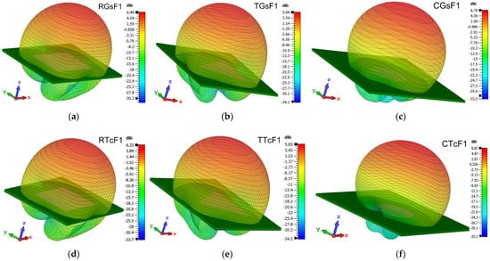 3D radiation patterns of the RGsF1 (a), TGsF1 (b), CGsF1 (c), RTcF1 (d), TTcF1 (e), and CTcF1 (f) prototypes.