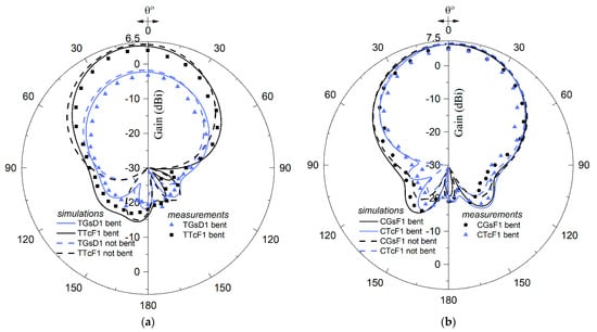 Simulated (dashed and solid curves) and measured (symbols) E-plane radiation patterns for φ = 0°, when (a) the TGsD1 and TTcF1 prototypes and (b) the CGsF1 and CTcF1 prototypes were bent over a tube, with diameters 100 mm, or not bent in free space.